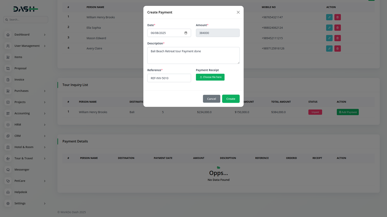 Facturatie.sr haalt het gedoe weg van financiële navigatie in de reisbranche. De Tours & Travels Management Module stelt u in staat om betalingen efficiënt te beheren, wat zorgt voor een soepel en veilig transactieproces. Van het bijhouden van betalingen tot het opstellen van financiële rapporten, deze module geeft je de controle, zodat je je kunt richten op het bieden van memorabele reiservaringen.